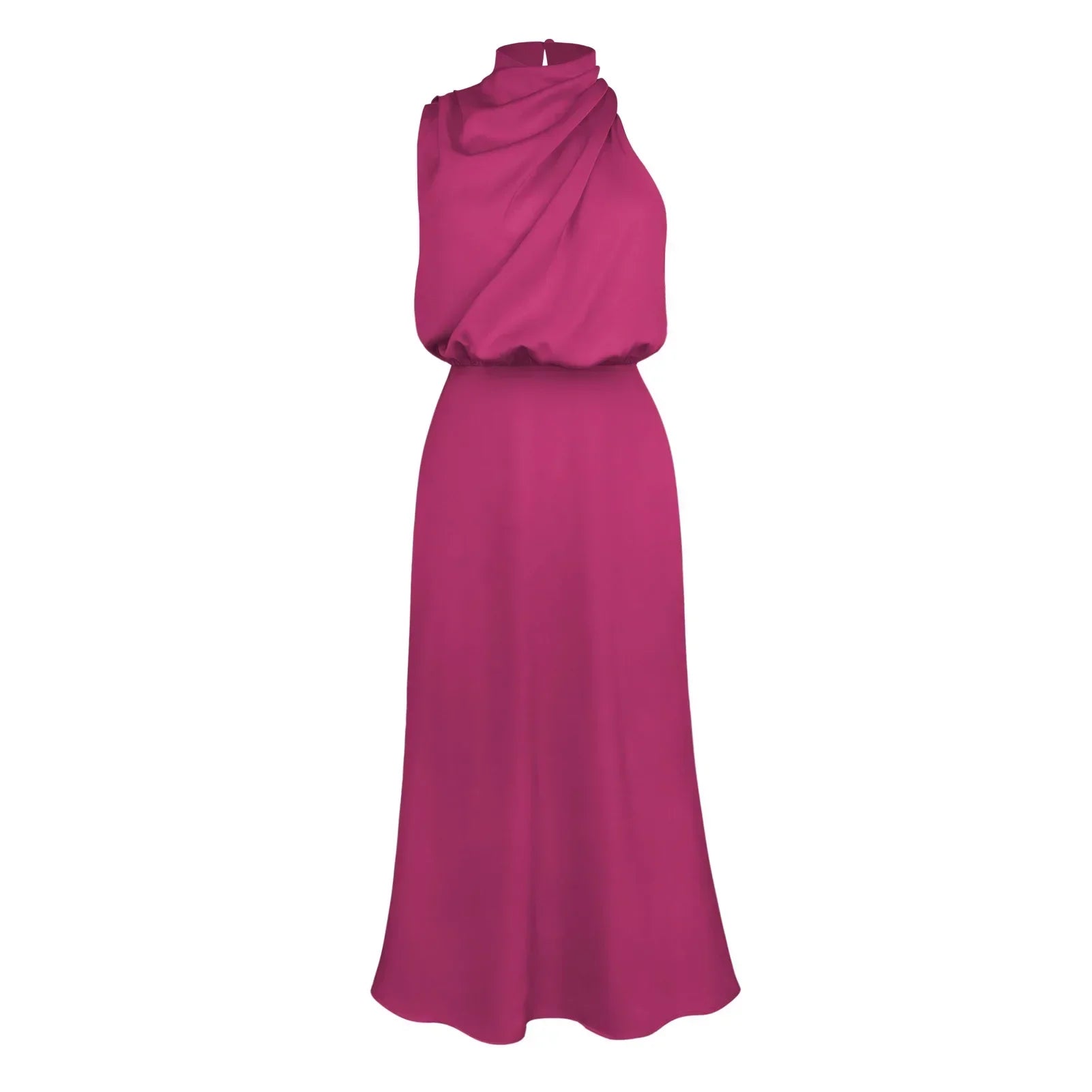 Vestido Feminino Midi Acetinado com Modelagem Acinturada Gola Alta e Detalhe Drapeado Elegante