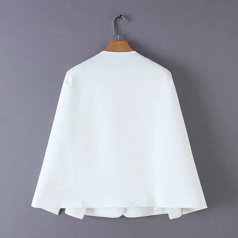 Se você quer fugir do blazer tradicional, mas ainda precisa de uma terceira peça elegante para trabalhar ou sair, esse capa‑blazer é perfeito.