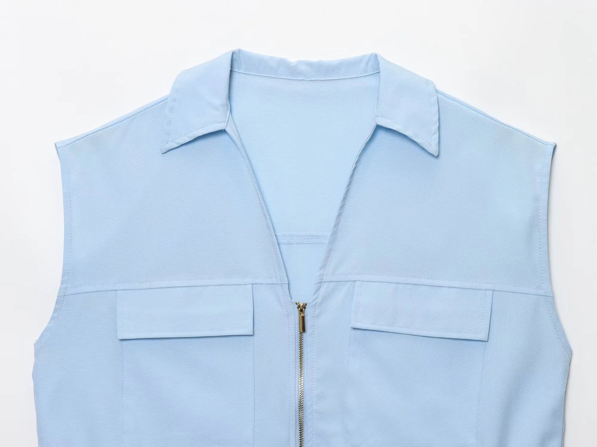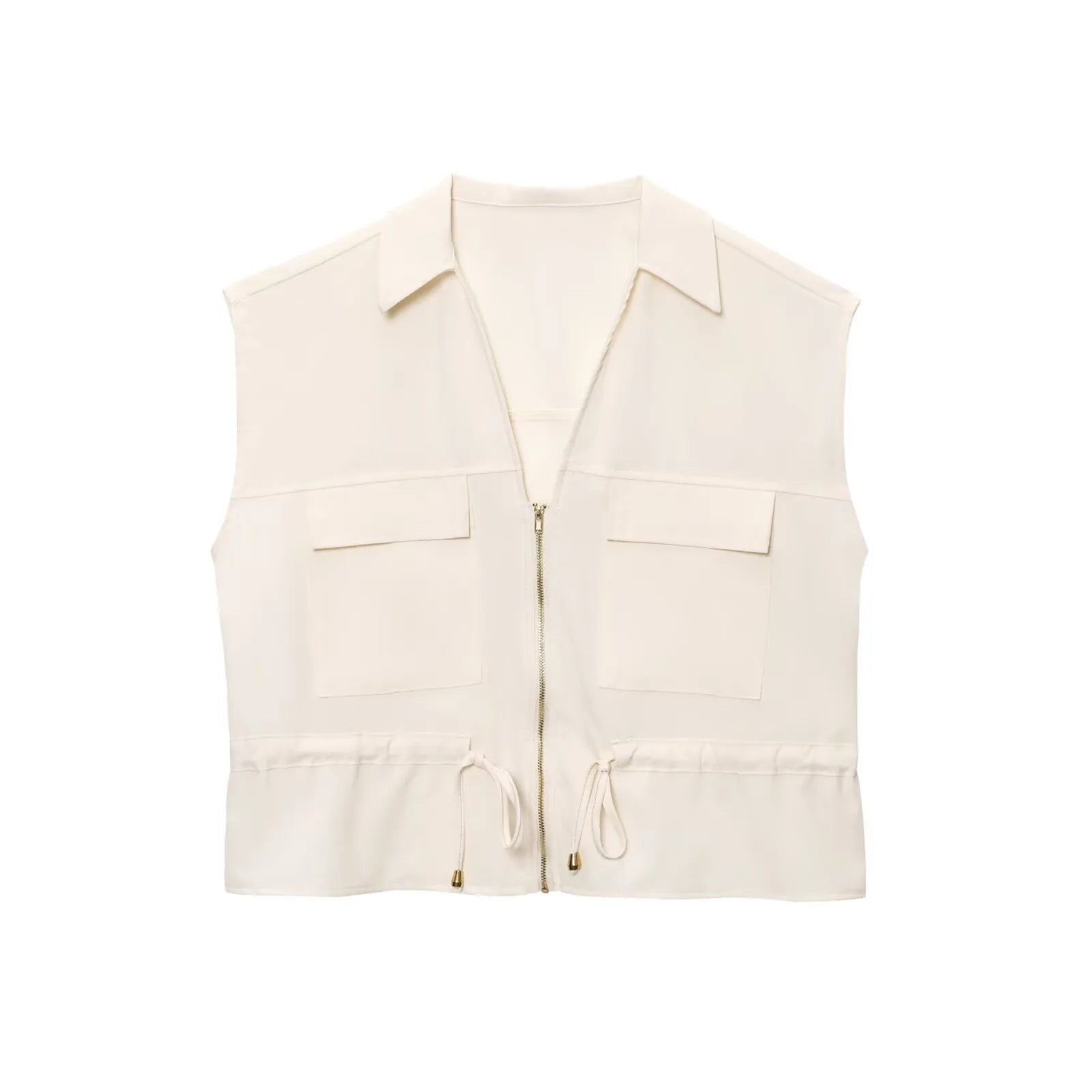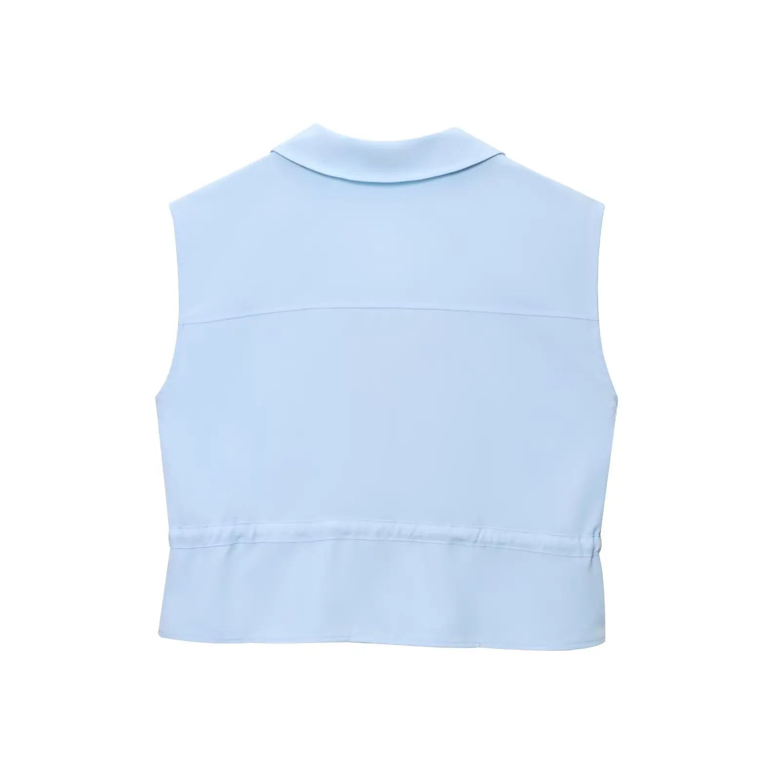 Conjunto BSK&TRAF – Novidades Verão 2025: Top feminino sem mangas estilo safari, com lapela e caimento confortável + calça casual de perna larga e cintura alta.