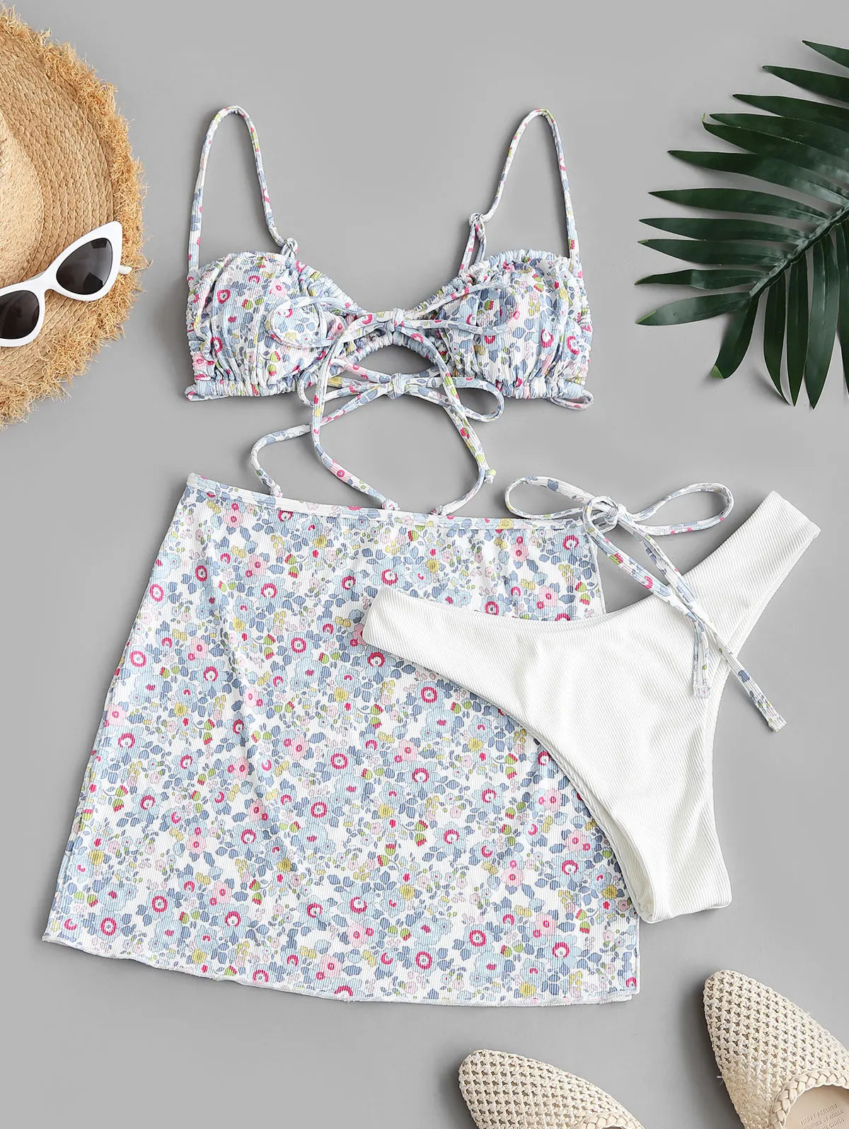 Biquíni floral canelado de três peças com amarrações.